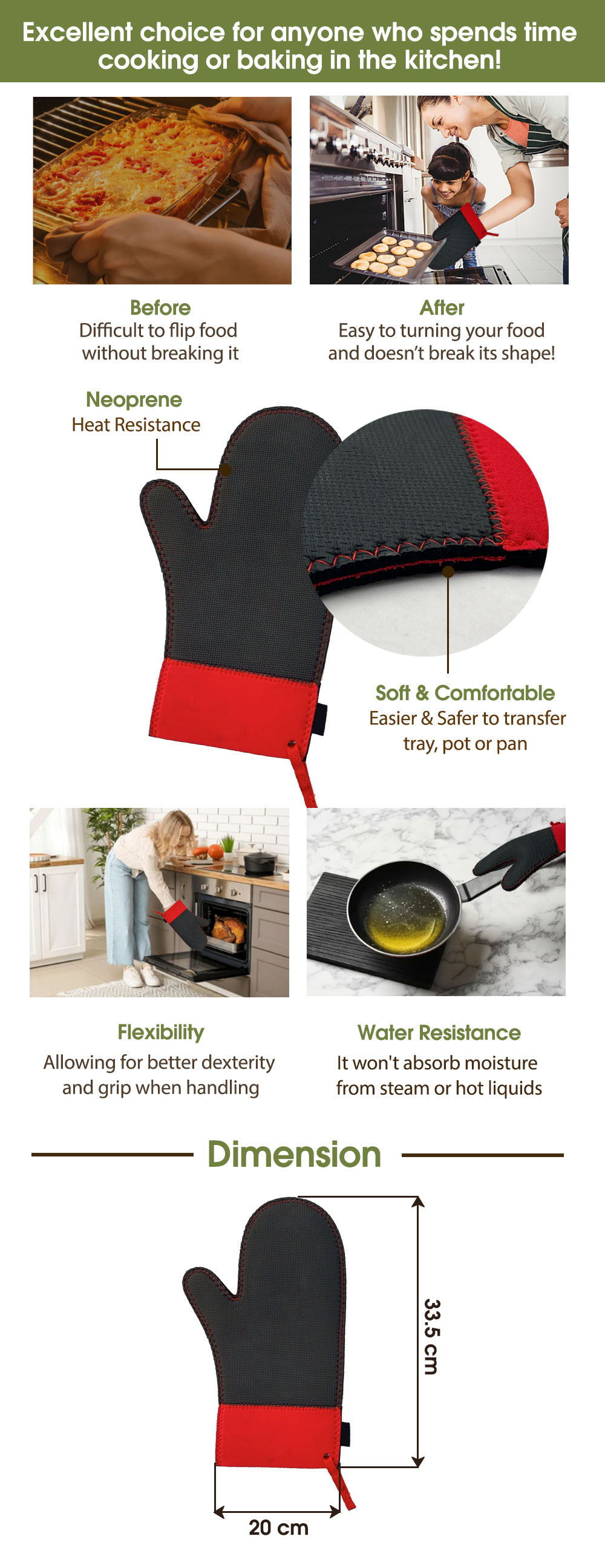 توفر قفاز الفرن المصنوع من النيوبرين حماية فائقة من الحرارة وقبضة آمنة للتعامل مع المقالي الساخنة والصواني والشوايات.
