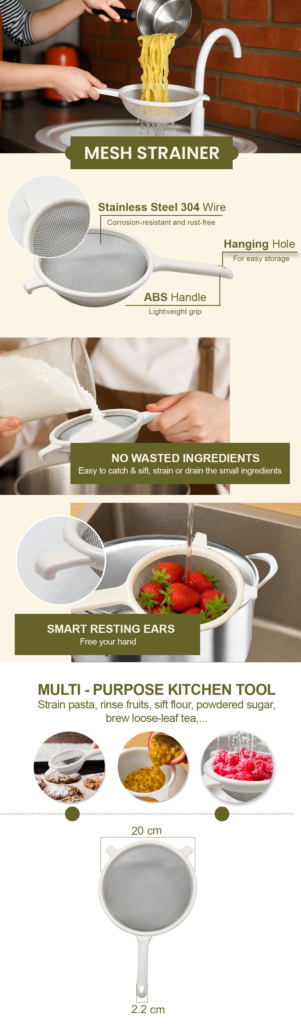 مصفاة شبكية من الفولاذ المقاوم للصدأ مقاس 7.8 بوصة، بمقبض ABS - tw