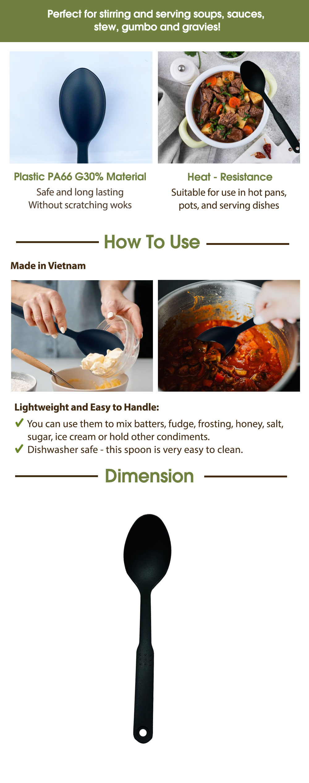 ملاعق التقديم المصنوعة من النايلون متعددة الاستخدامات ويمكن استخدامها لتقديم مجموعة واسعة من الأطباق، بما في ذلك اليخنة والحساء والمعكرونة والمزيد. كما أنها مناسبة للتحريك والخلط.