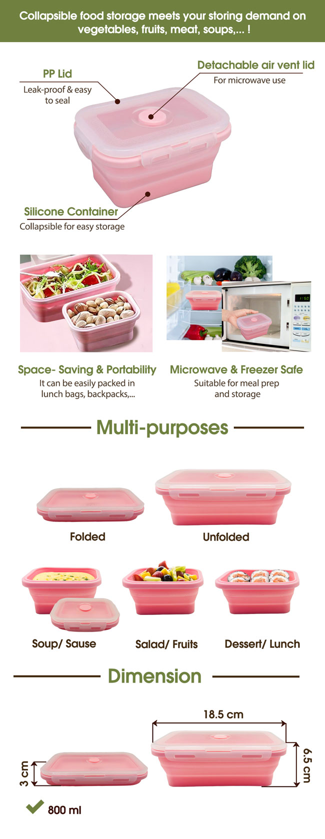 صنع في فيتنام 800 مل من السيليكون المستطيل لتخزين الطعام القابل للطي