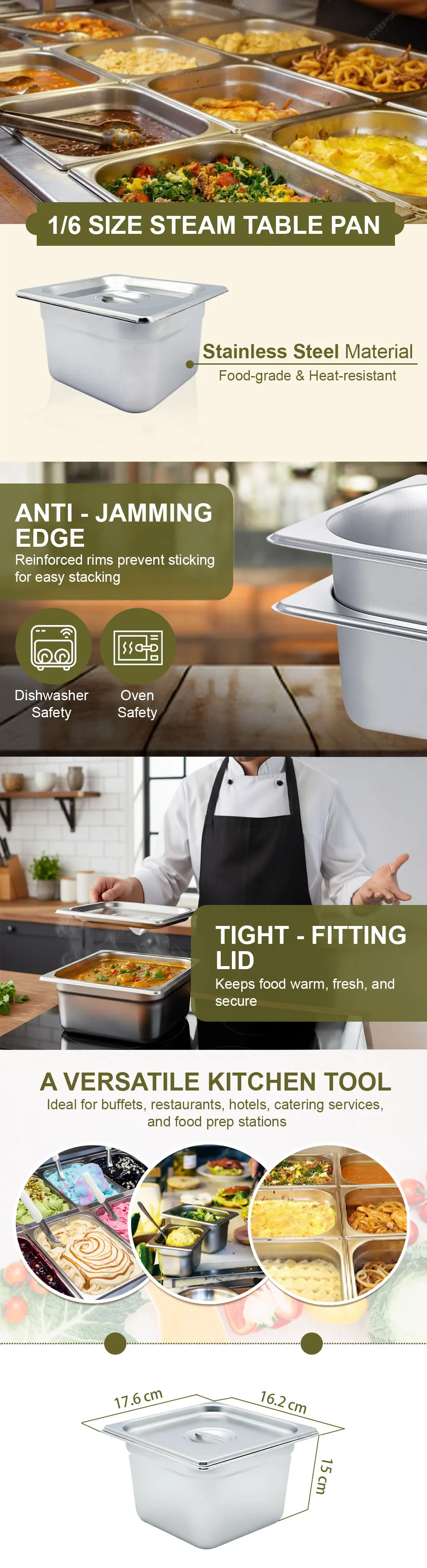 1/6 size stainless steel deep steam table pan with tight-fitting lid