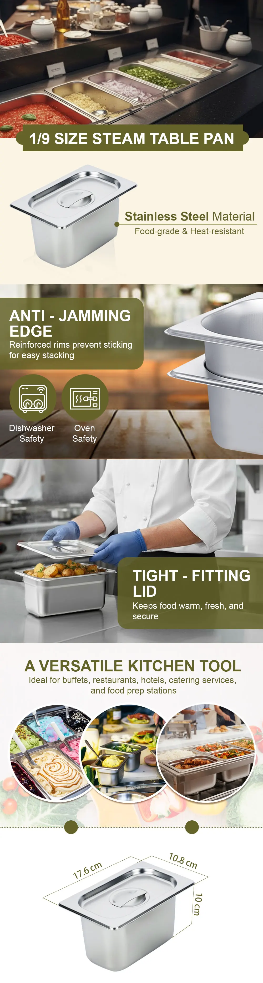 This 1/9 size stainless steel steam table pan is designed for professional food service environments where durability, hygiene, and efficiency matter. Crafted from food-grade stainless steel, it offers excellent heat resistance and long-term performance for hot and cold food holding.