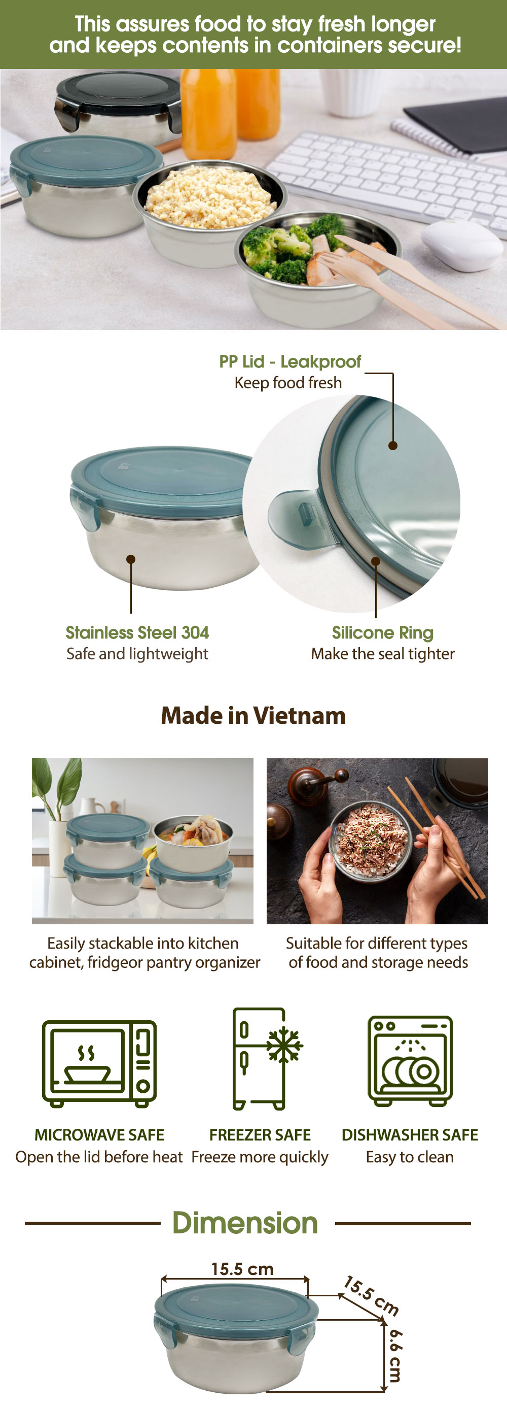 حاوية من الفولاذ المقاوم للصدأ مع غطاء بلاستيكي من البولي بروبلين، توفر حلاً للتخزين مانعًا للتسرب وخاليًا من الغبار مما يحافظ على نضارة أطباقك.