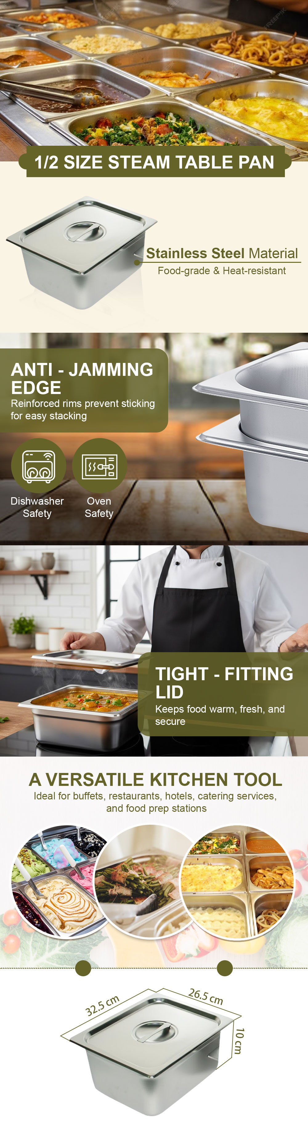 • Heat Resistance: Suitable for oven and steam table use