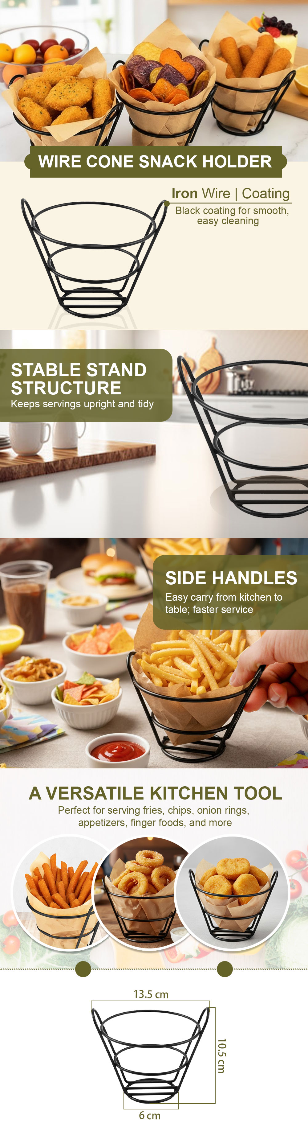 Crafted from coated iron wire, the cone-shaped structure keeps snacks upright and neatly displayed, while the side handles allow easy carrying from kitchen to table. Ideal for restaurants, cafés, and home entertaining, it adds a modern touch to any serving setup.