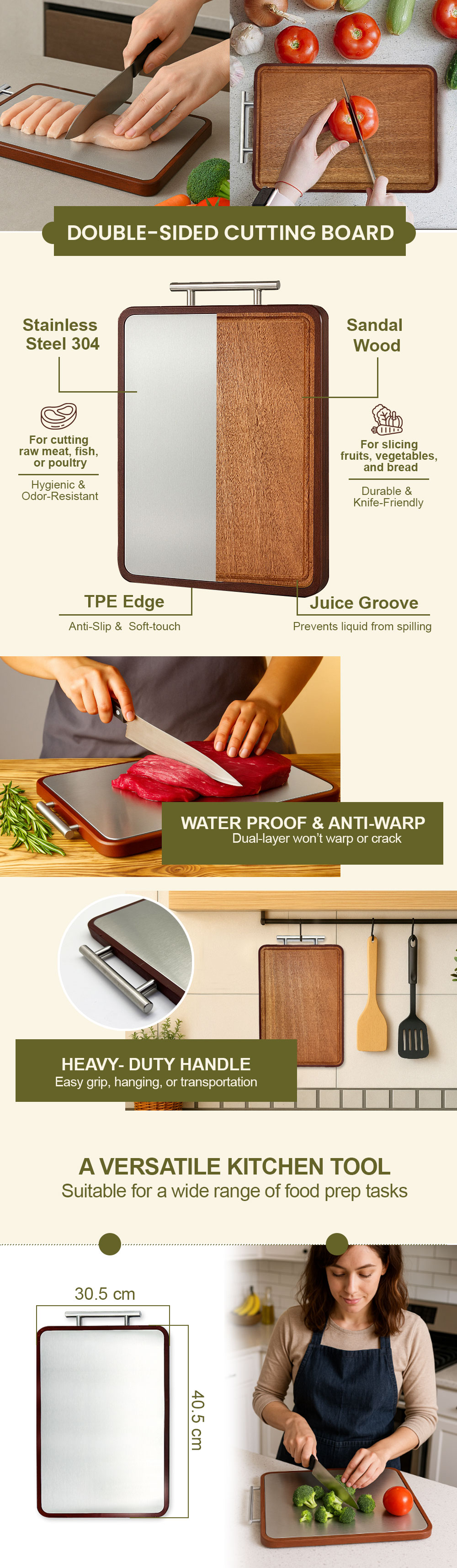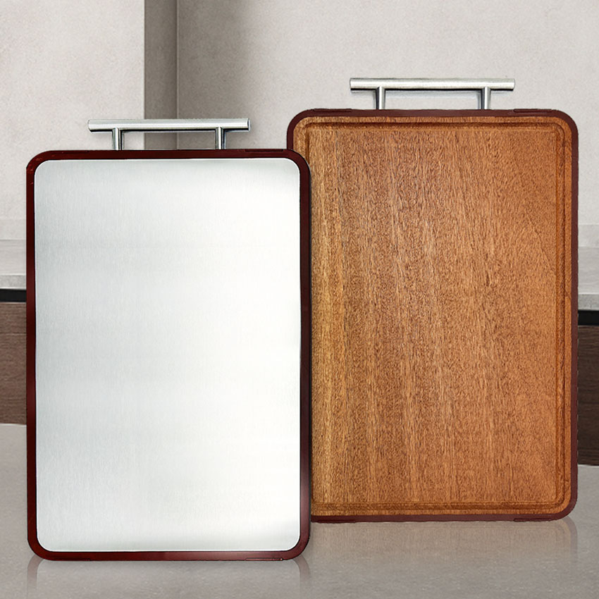 تتميز لوح التقطيع ذو الوجهين بسطح صحي من الفولاذ المقاوم للصدأ مثالي للحوم وجانب متين من خشب الصندل مثالي للفواكه والخضروات.