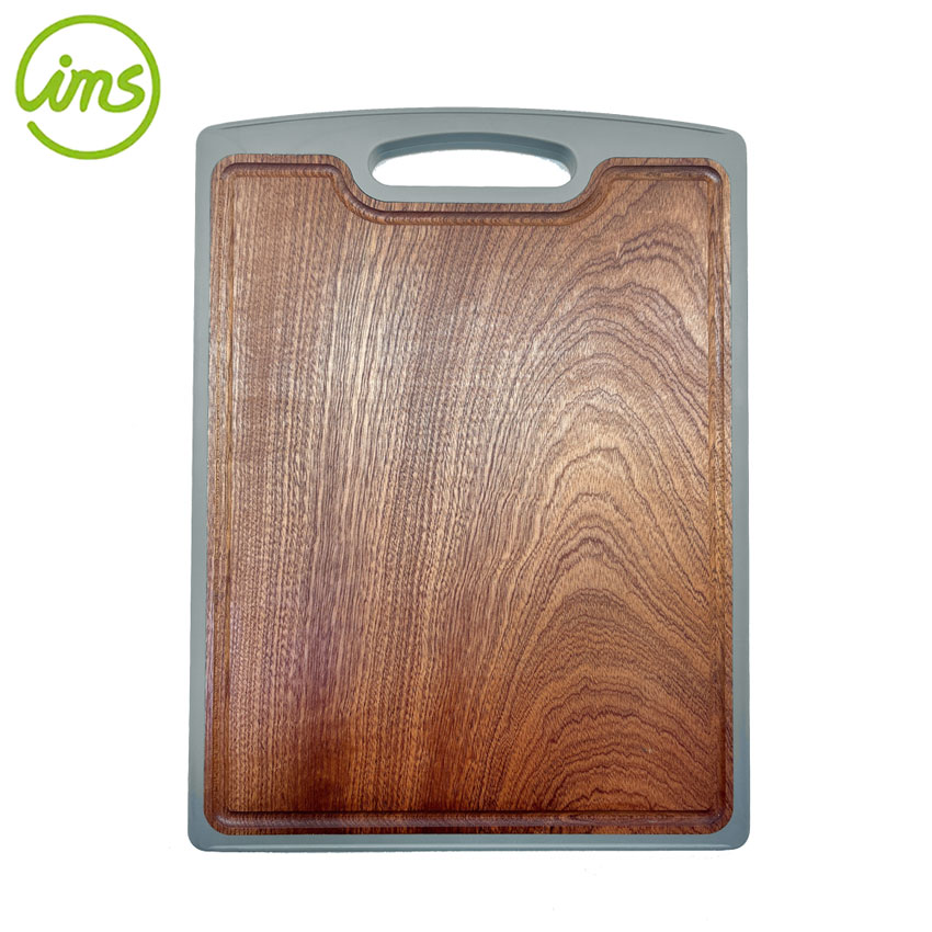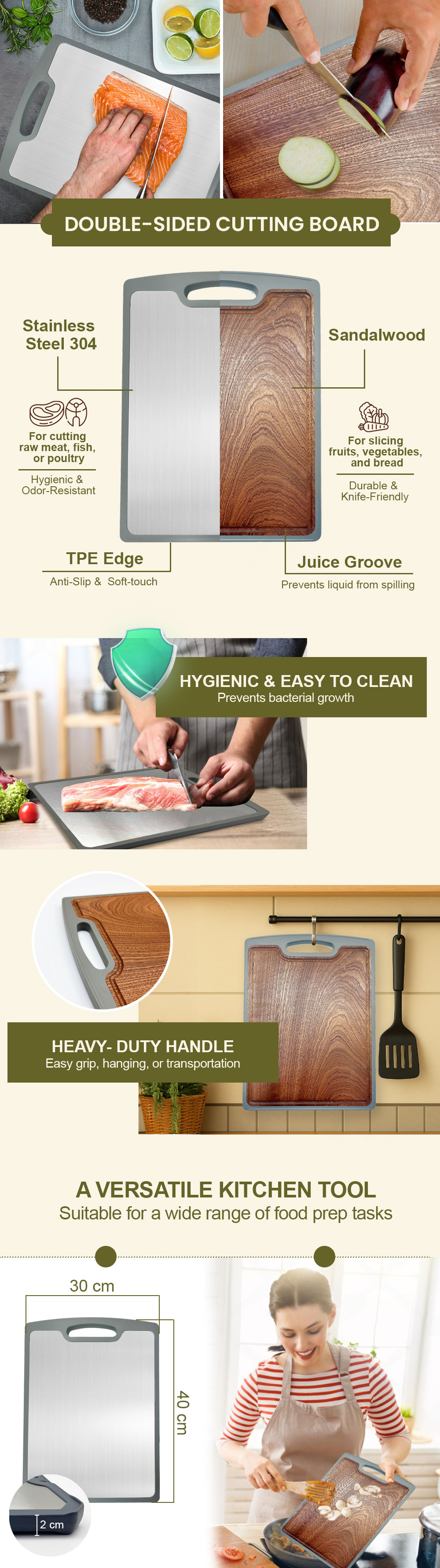 تتميز لوح التقطيع ذو الوجهين بسطح صحي من الفولاذ المقاوم للصدأ مثالي للحوم وجانب متين من خشب الصندل مثالي للفواكه والخضروات.