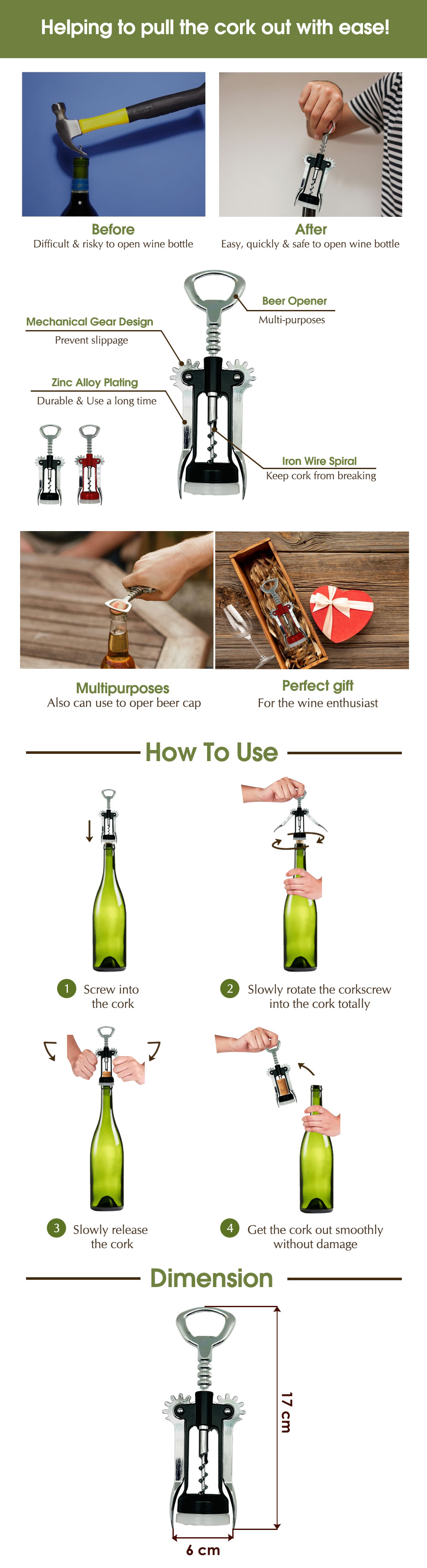 يتميز المفتاح المجنح 2 في 1 بأنه متعدد الاستخدامات ويمكن استخدامه في العديد من الزجاجات ذات الفلين، وليس فقط النبيذ. يمكن استخدامه لفتح قبعات البيرة أيضًا.