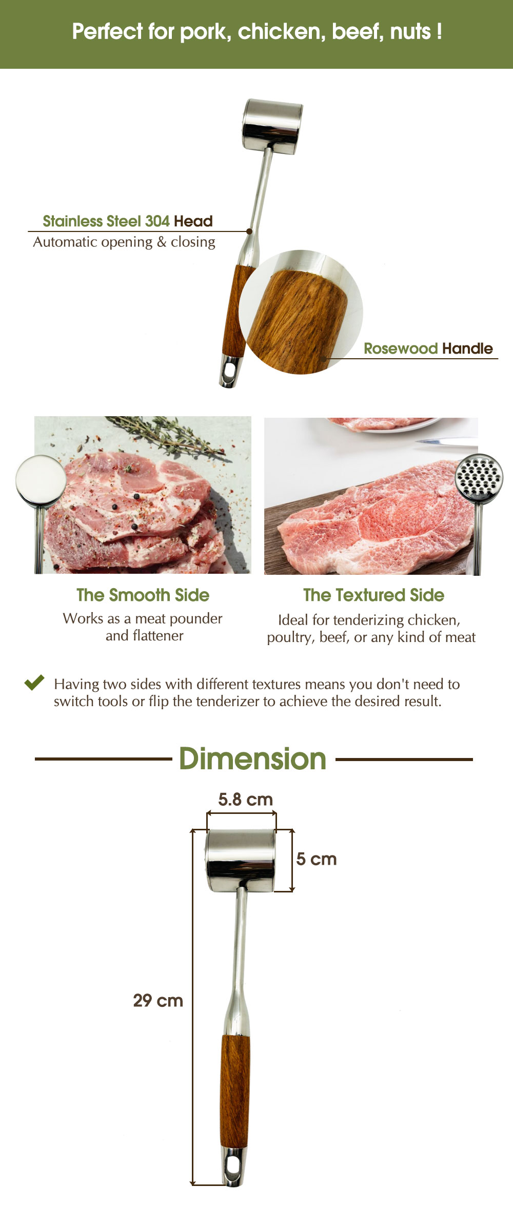 يمكن استخدام الجانب المسطح لطحن القطع، مما يساعد على إطلاق النكهات الطبيعية والطهي بالتساوي؛ سوف يقوم الجانب المحكم بتكسير البروتينات الصلبة بسهولة ويجعل من السهل قطعها ومضغها.
