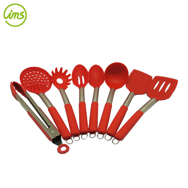 Silikon-Kochutensilien-Set beinhaltet Schaumlöffel, Pfannenwender, Schaumlöffel, massiven Löffel, Suppenkelle, Nudelheber, Zange, Schneebesen