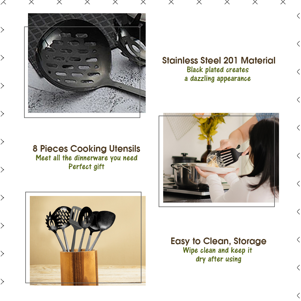 Werten Sie Ihren Küchenstil mit diesem 8-teiligen, schwarz beschichteten Küchenutensilienset auf.