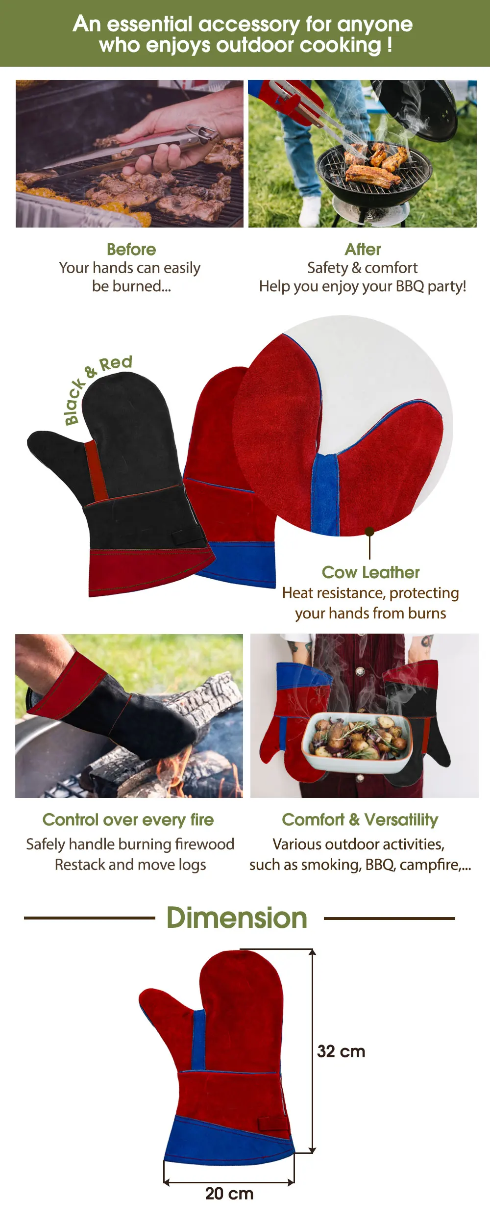 Premium Cow Leather Construction: Durable natural leather provides strong heat resistance and long-lasting protection during grilling or fire handling.