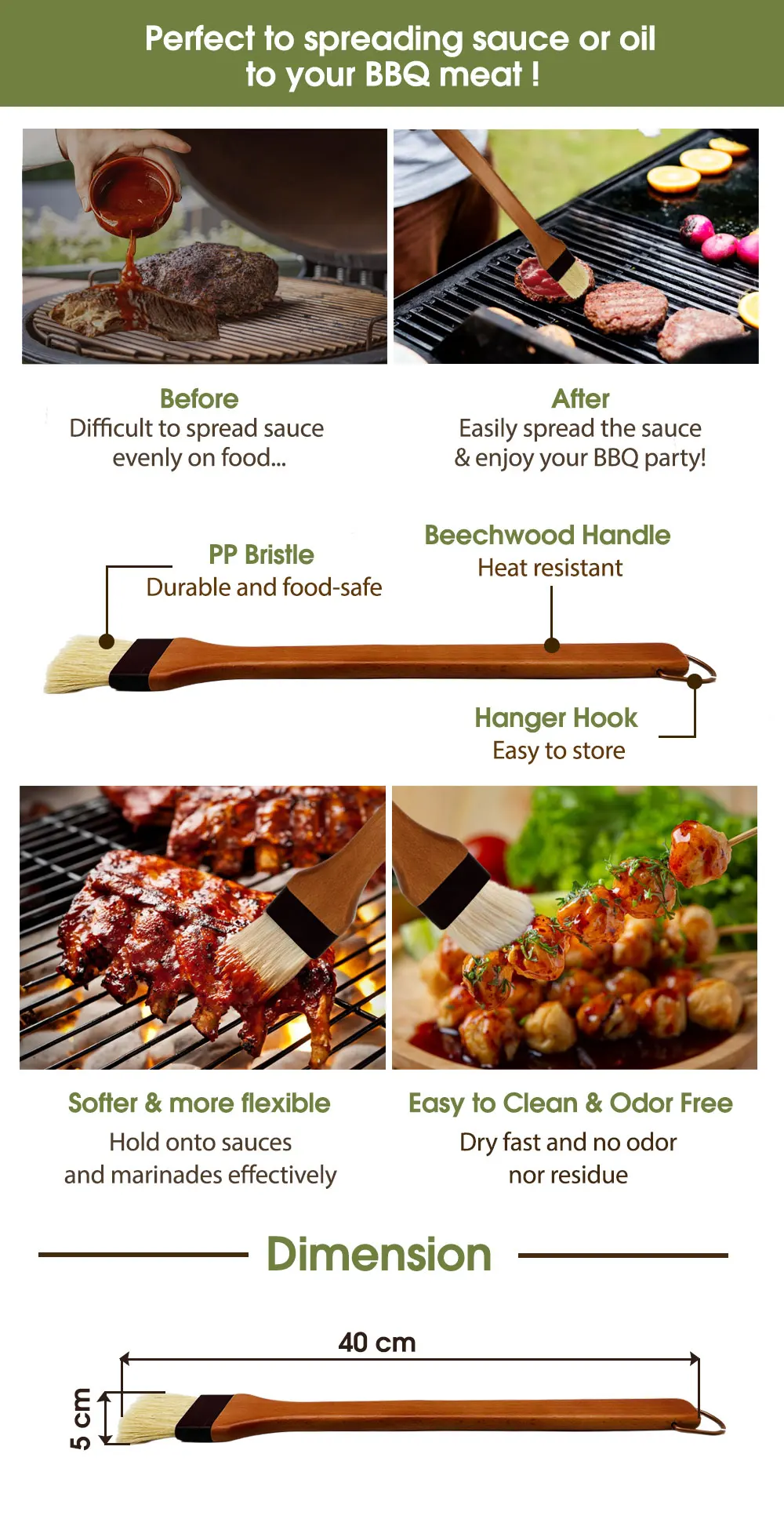 This BBQ sauce basting brush is designed to evenly apply sauces, marinades, butter, and oil to grilled foods. The durable PP bristles hold sauce effectively and distribute it smoothly across meat, seafood, and vegetables during grilling. The long beechwood handle provides a comfortable grip while helping keep hands safely away from grill heat. With its lightweight design and convenient hanging hook, this BBQ brush is ideal for outdoor barbecues, grilling, smoking meats, and everyday kitchen cooking.