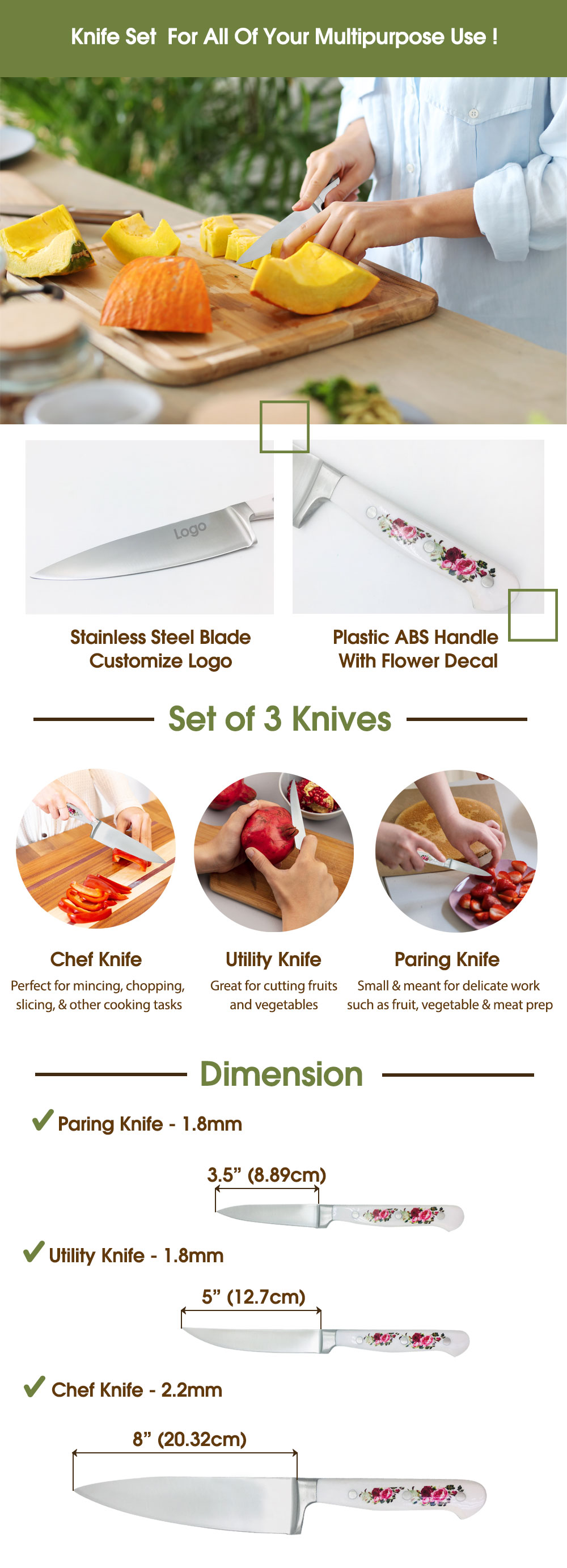 3-teiliges Edelstahl-Messer-Set mit floralem Griffdekal