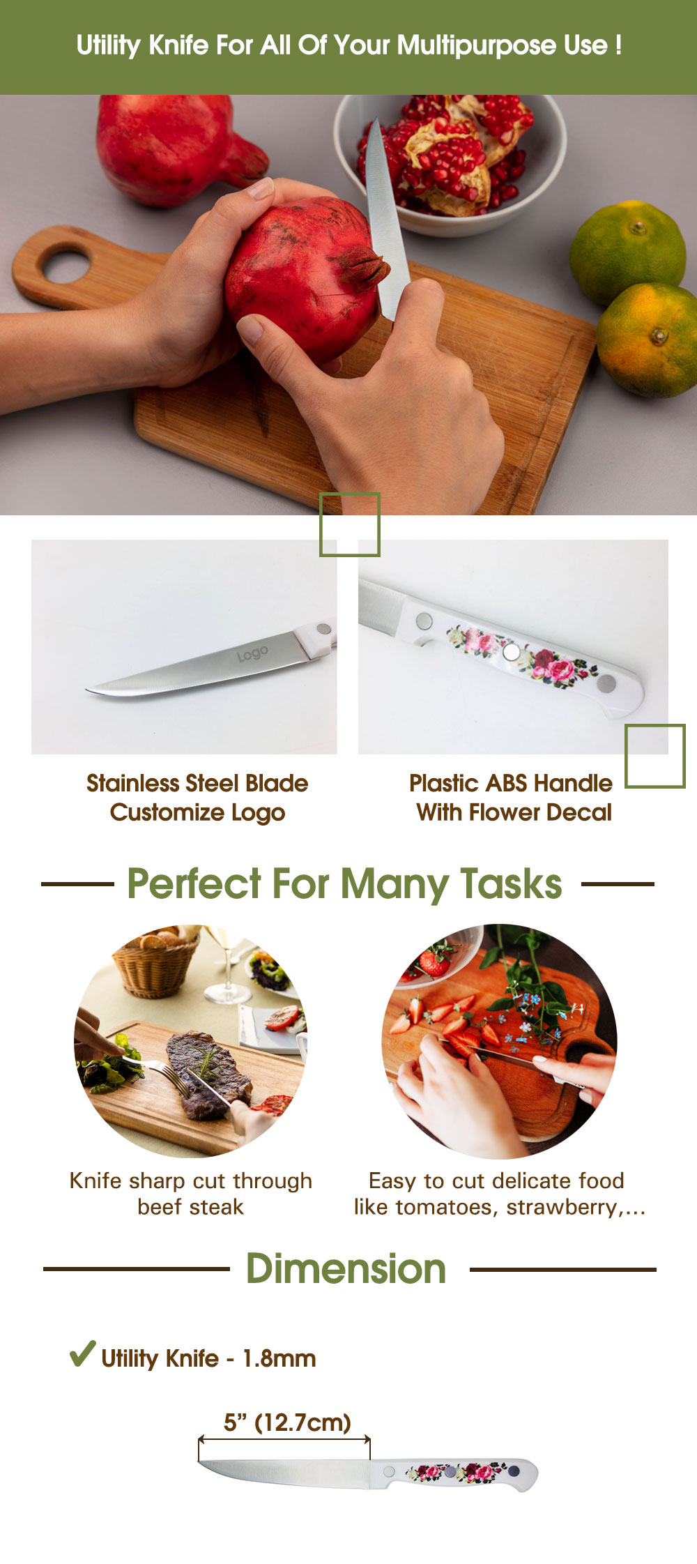 5-Zoll Universalmesser aus langlebigem Edelstahl mit einem charmanten blumenverzierten Griff. Perfekt für alltägliche Schneid-, Schneide- und Trimmanwendungen in sowohl professionellen Küchen als auch in der heimischen Kochumgebung.