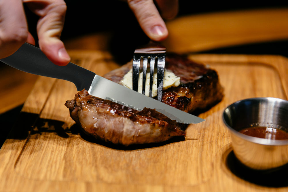 Die Verzahnung der Klinge eines Steakmessers ermöglicht ein einfaches und effizientes Schneiden von Fleisch, ohne es zu zerreißen oder zu zerkleinern.