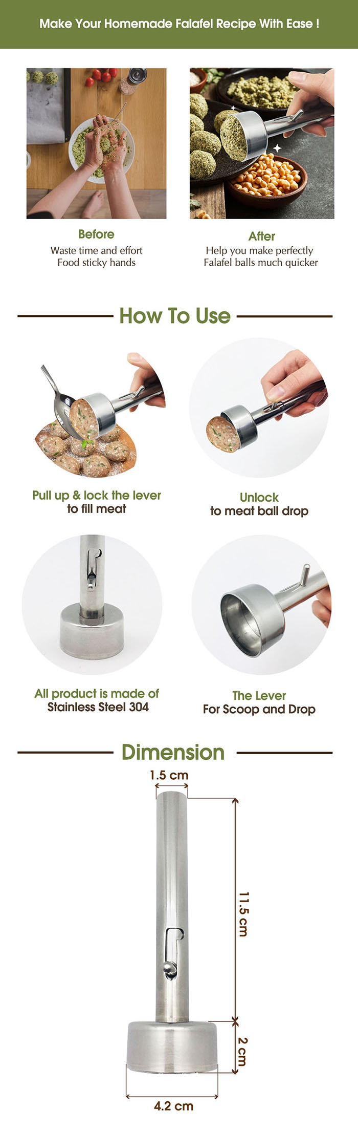 Die Falafelpresse mit einem Schloss ist sehr einfach zu bedienen, da sie nur mit einer Hand bedient werden kann. Der Verschluss hält den Teig beim Pressen an Ort und Stelle und erleichtert so das Formen der Falafelbällchen.