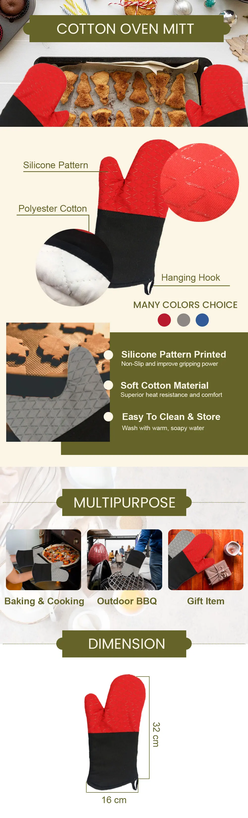 The Heat Resistant Cotton Printed Waffle Style Oven Mitt is designed to provide safe and comfortable protection when handling hot cookware in the kitchen or during outdoor BBQ grilling. Made with durable polyester cotton and enhanced with a silicone printed grip pattern, this oven mitt improves handling stability while protecting hands from high temperatures.