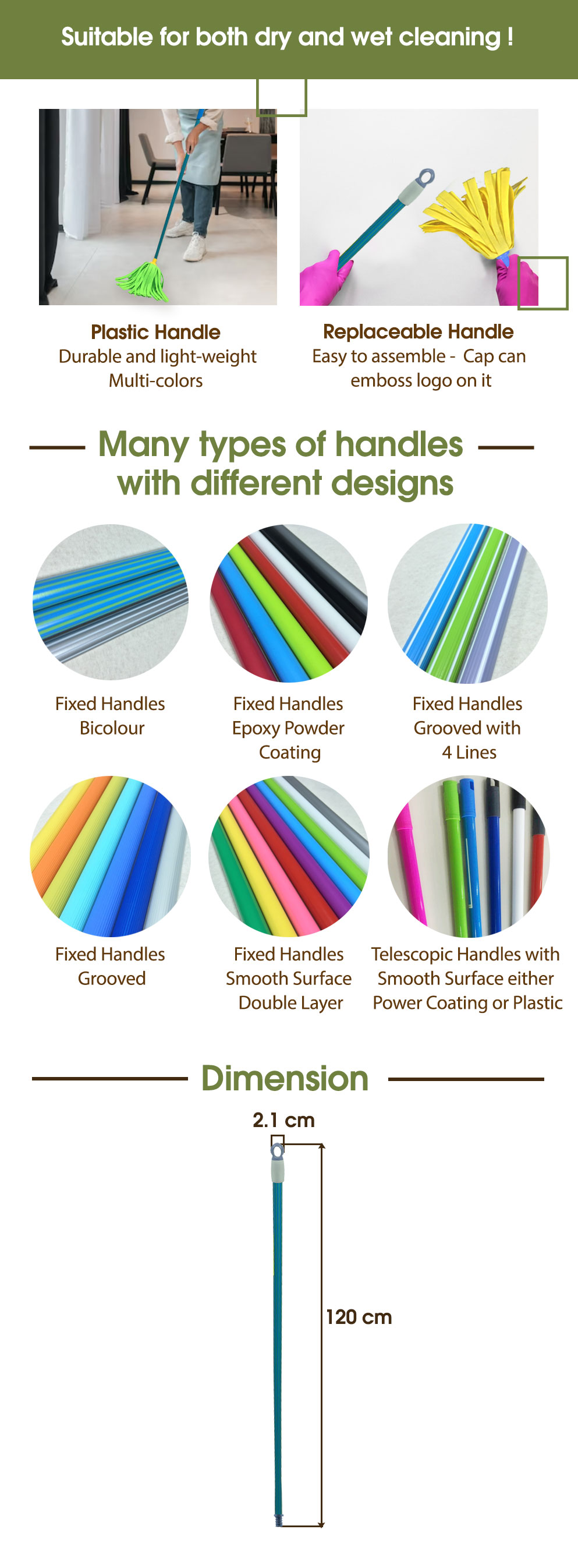 Este mango suele ser una varilla alargada, recta o telescópica que le permite maniobrar el trapeador por el piso.