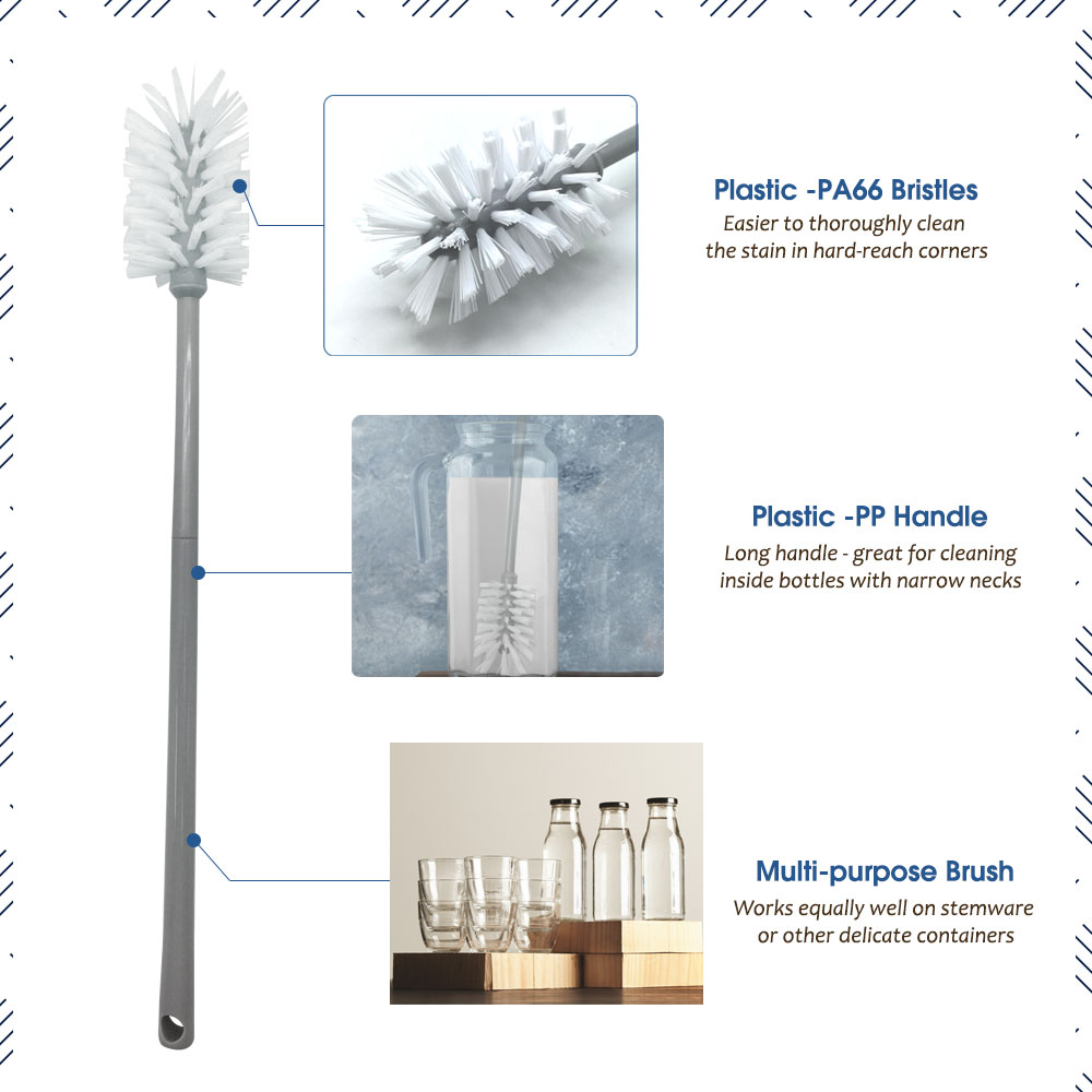 Ces brosses ne se limitent pas uniquement aux bouteilles de nettoyage. Ils peuvent nettoyer efficacement divers articles tels que des vases, des carafes, des pichets, des flacons, des biberons, des bouteilles d'eau, de la verrerie de laboratoire et d'autres récipients à col étroit.