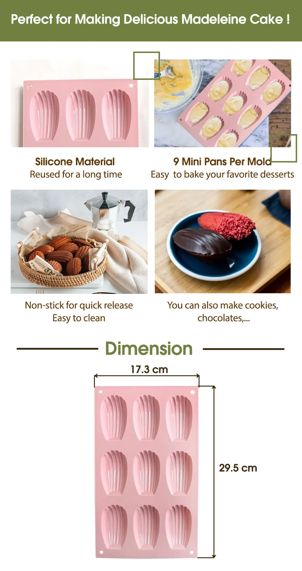 • 9 individual shell cavities for evenly baked madeleine cakes