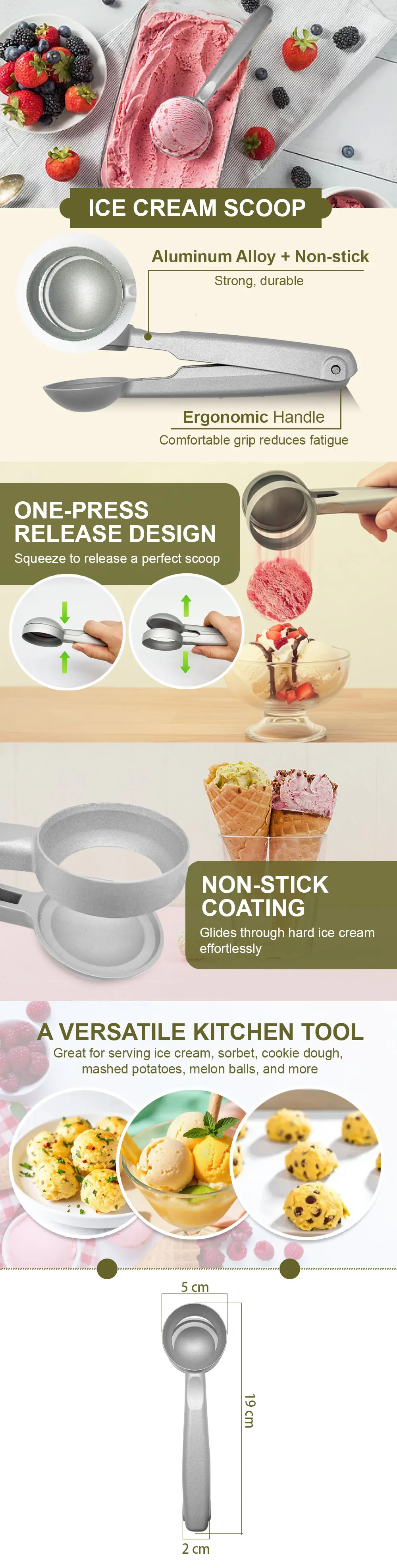 Perfect for serving ice cream, gelato, and sorbet, as well as portioning cookie dough, mashed potatoes, and other soft foods. Ideal for home kitchens, dessert shops, cafes, and catering services.