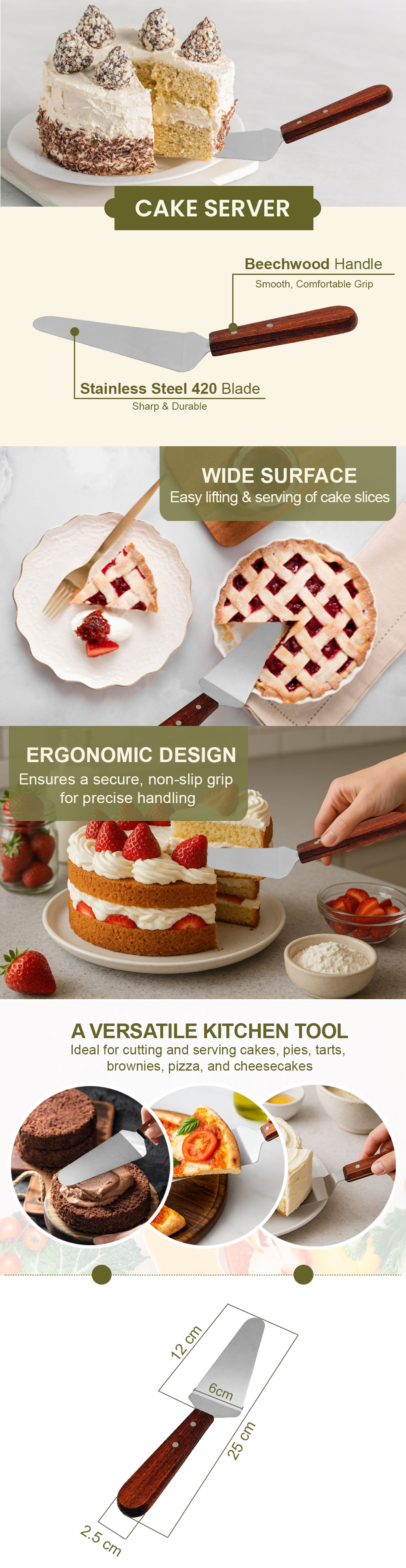 Angled Triangular Design: Allows effortless lifting and transferring of cakes, pies, and tarts.