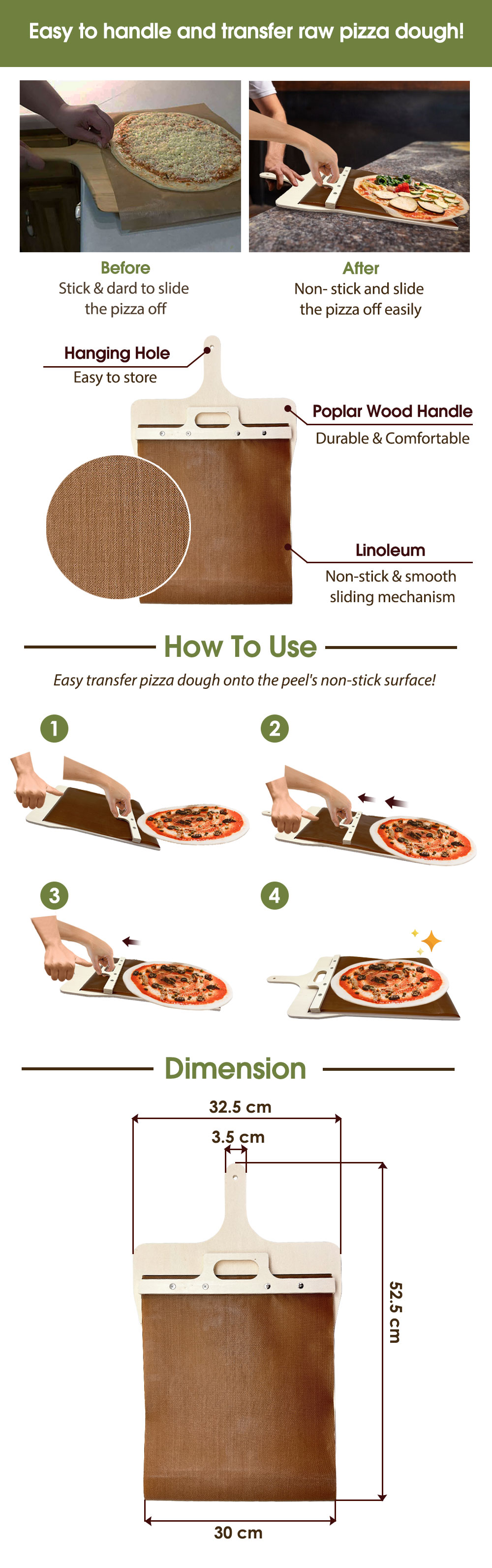 Non-Stick Sliding Surface: Linoleum design allows pizzas to glide smoothly without sticking.