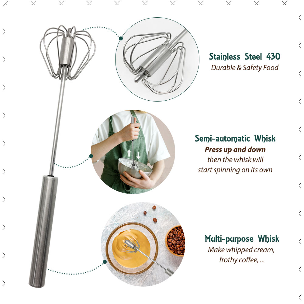 Perfect for everyday cooking and baking tasks, this whisk is designed to beat eggs, mix batters, whip cream, froth milk for lattes, and blend sauces or gravies. Its semi-automatic mechanism makes it especially convenient for creating airy, fluffy textures in seconds.