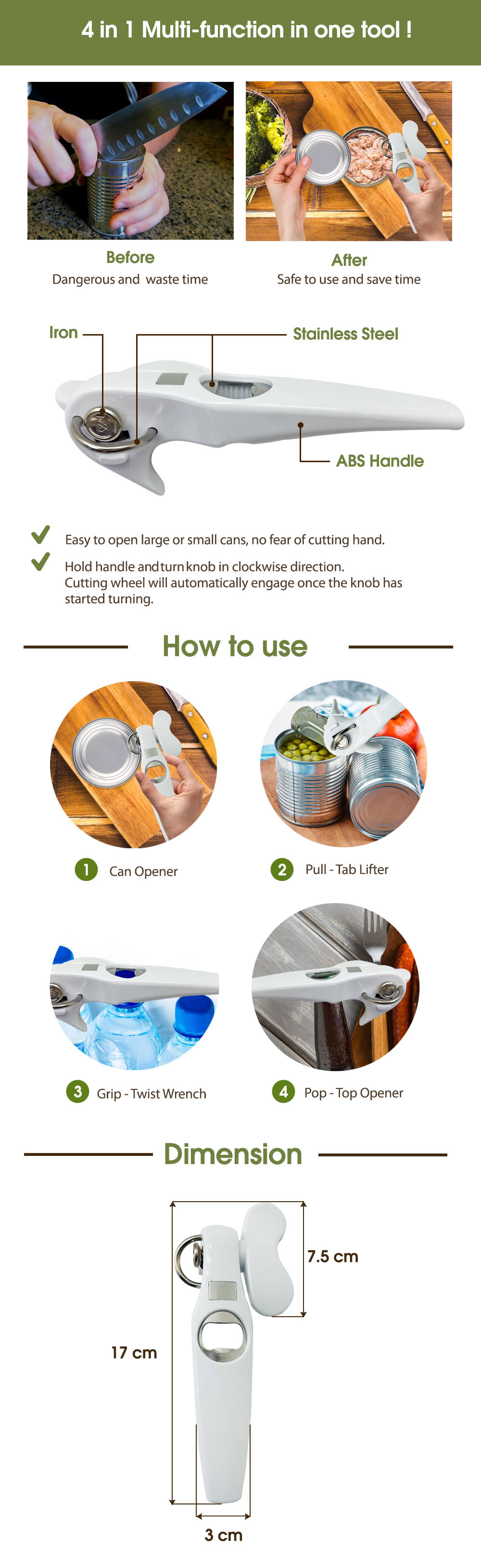 Perfect for opening canned goods, soda or beer bottles, jar pull-tabs, and twist caps. Suitable for home kitchens, outdoor cooking, bars, and restaurants. Its multifunction design makes it a great tool for households looking for convenience and safety in one device.