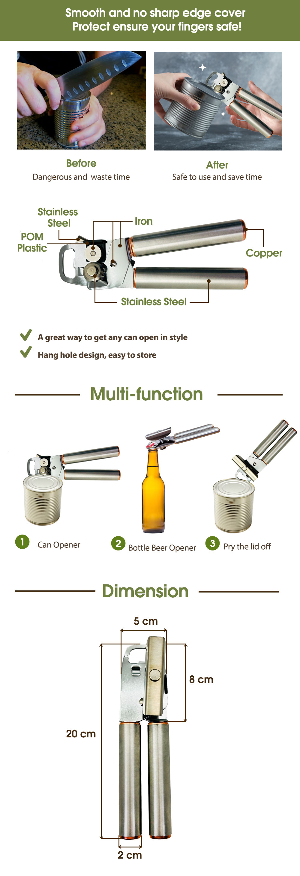 Ideal for opening canned foods, beer bottles, soda caps, and jar lids. Designed for heavy-duty performance, making it suitable for households, restaurants, bars, and catering services. Its sleek stainless steel and copper finish makes it a stylish addition to modern kitchens.
