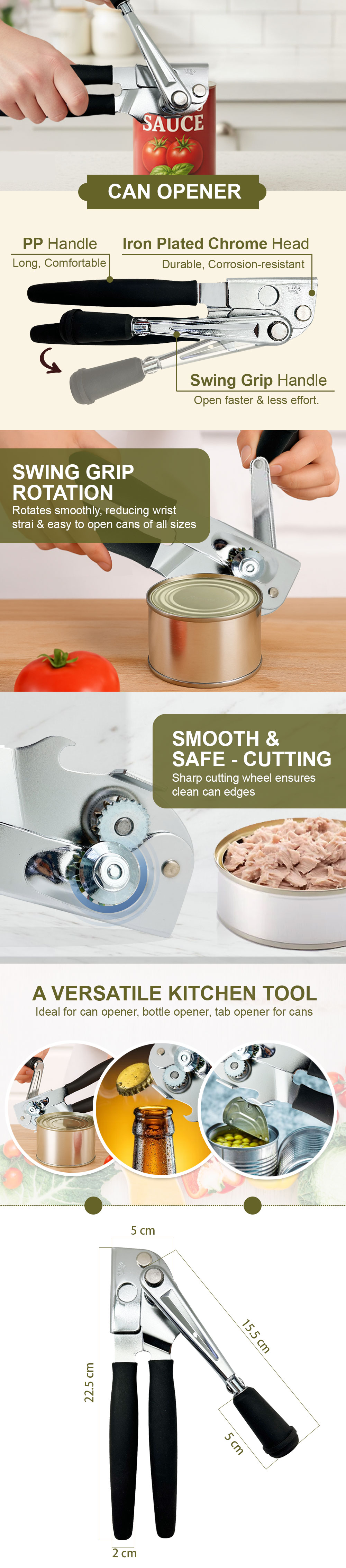 Multi-Purpose Use: Functions as a can opener, bottle opener, and tab opener—perfect for every kitchen.