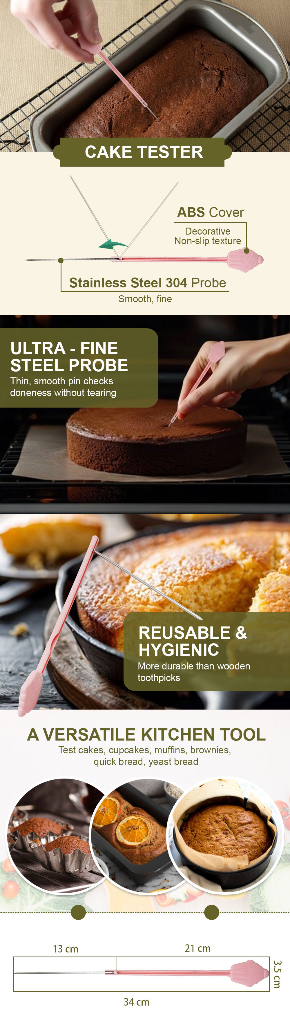 Perfect for testing cakes, cupcakes, muffins, brownies, quick breads, and yeast loaves. A must-have kitchen tool for bakers who want precise doneness checking without damaging delicate textures. Suitable for both home and commercial kitchens.