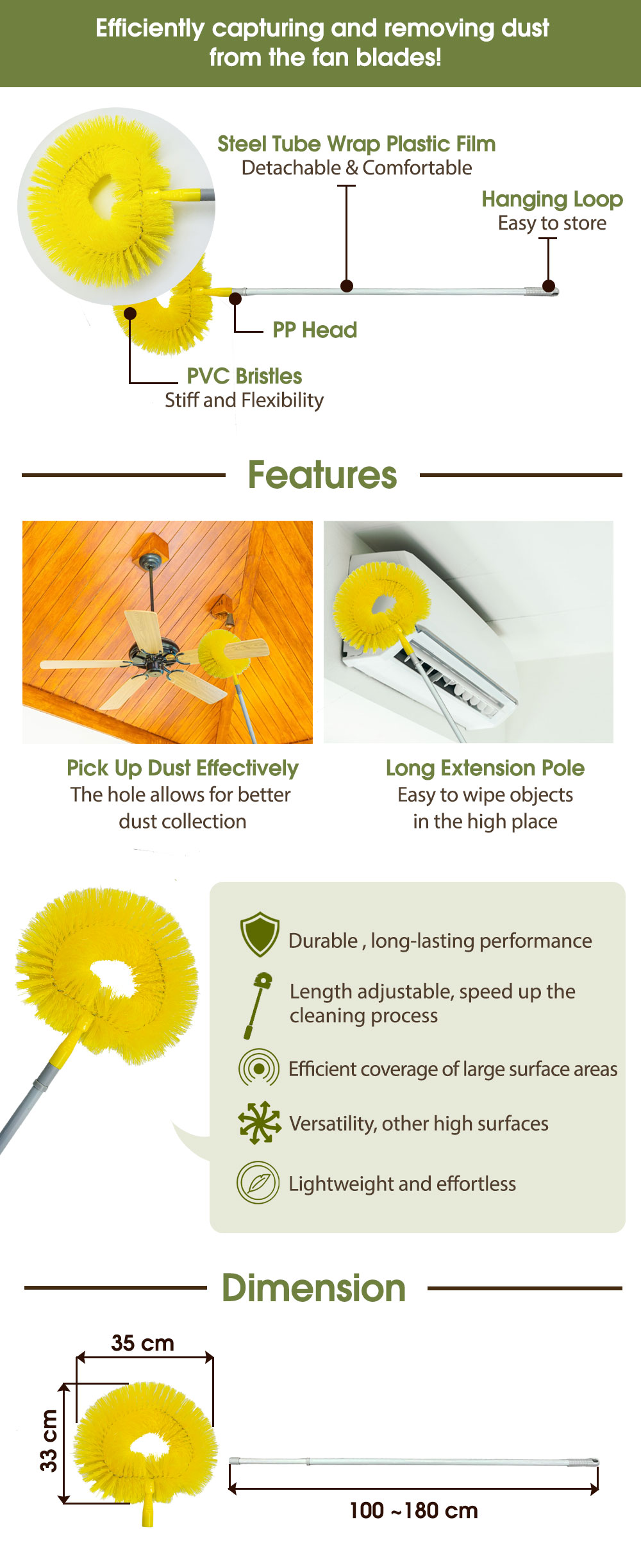 Ideal for cleaning ceiling fans, air conditioners, light fixtures, walls, and corners. Perfect for use in homes, offices, hotels, and classrooms—anywhere that requires efficient dust removal from high surfaces.