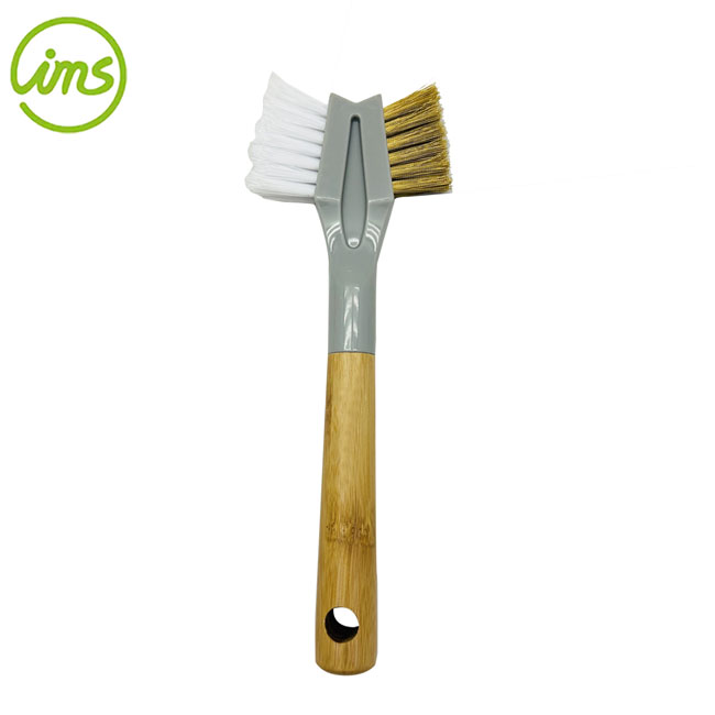 2-in-1 Gray Kitchen Cleaning Brush with Brass & Nylon Bristles | Bamboo Handle