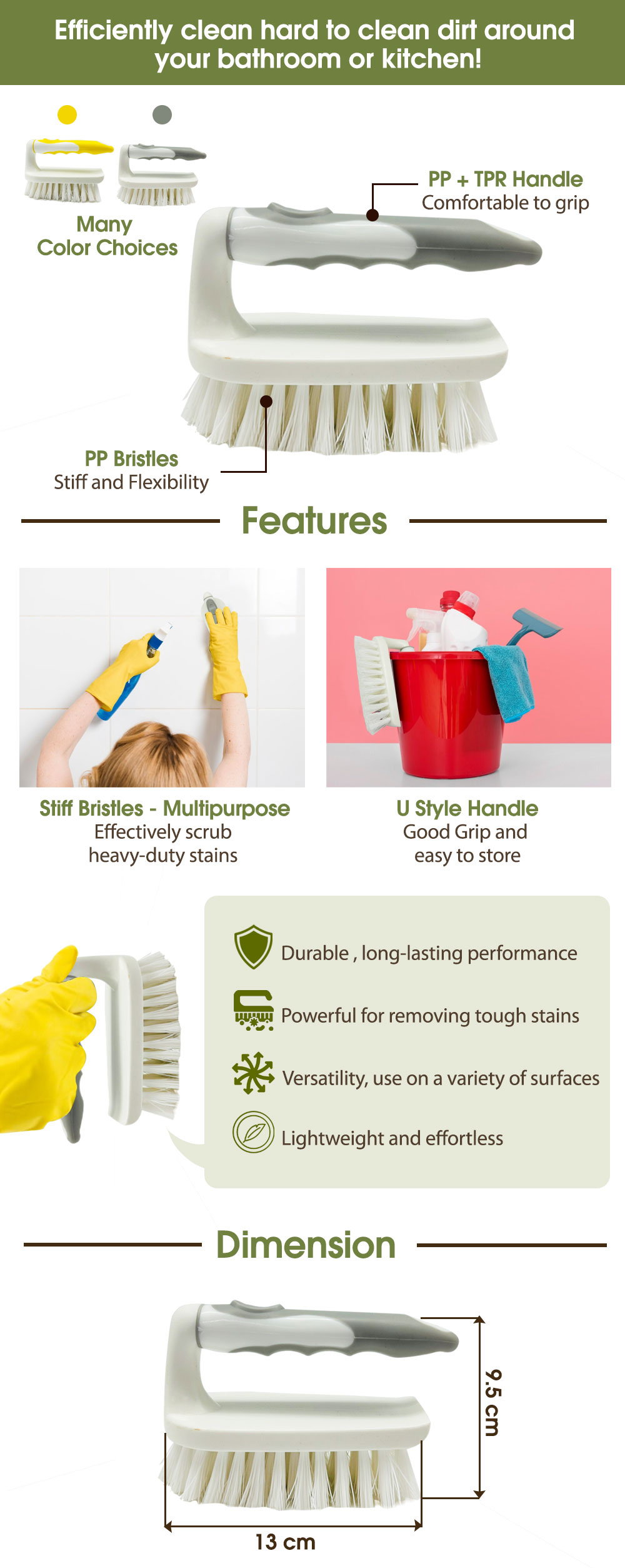 Stiff PP bristles provide powerful scrubbing action for stubborn dirt and grime.
