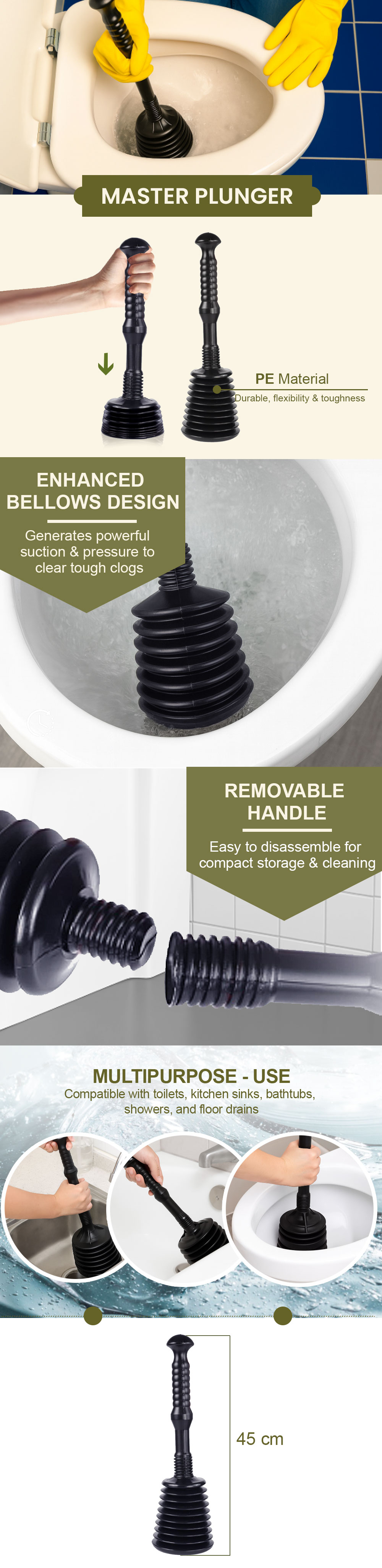 Perfect for use in homes, offices, and commercial restrooms, this master plunger effectively removes clogs from toilets, kitchen sinks, and floor drains. Its high-pressure bellows system makes it an essential tool for both everyday maintenance and deep cleaning.