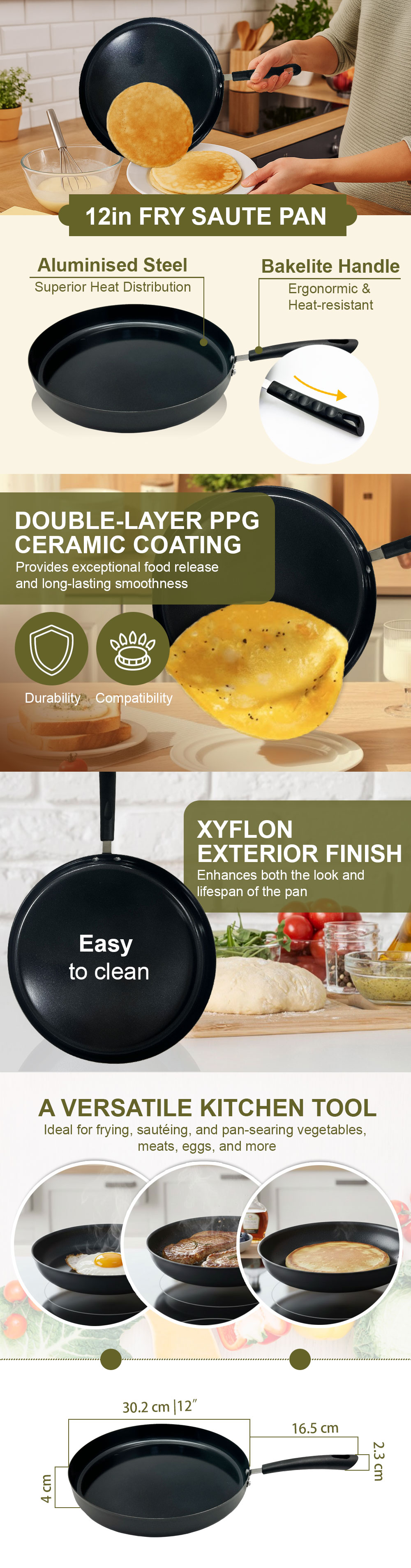 Ideal for preparing omelettes, sautéed vegetables, fried eggs, pancakes, seared meats, stir-fries, and large skillet meals. A practical choice for home cooks seeking a large, reliable, easy-to-clean non-stick pan.