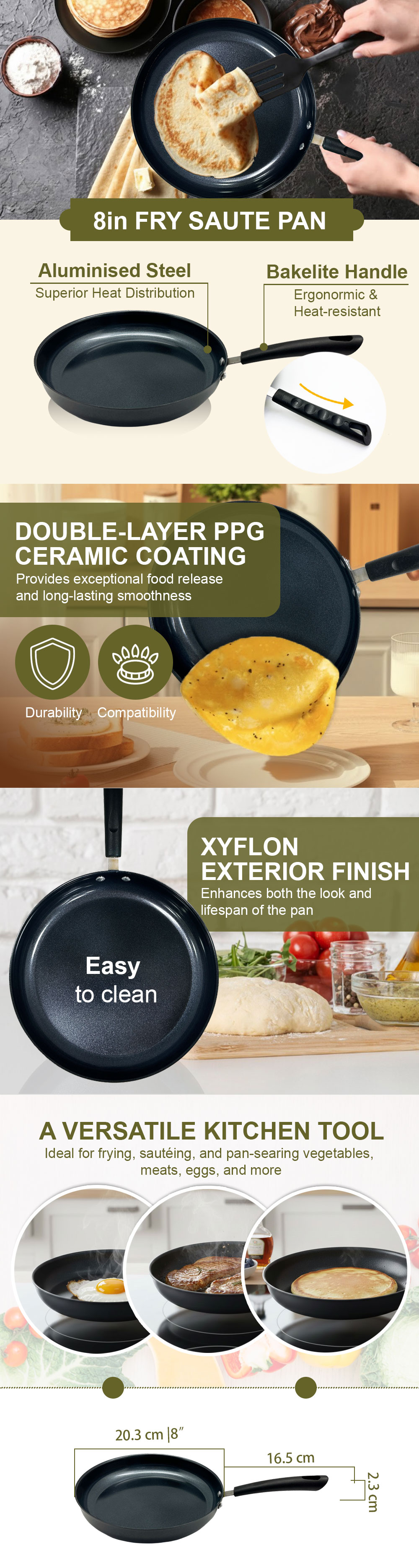 This 8-inch fry and sauté pan is engineered for smooth, versatile everyday cooking. Built with aluminised steel for fast, even heat distribution and coated with a durable double-layer PPG ceramic surface, it delivers excellent non-stick performance for eggs, pancakes, meat, vegetables, and more. The ergonomic Bakelite handle stays cool during cooking, while the Xyflon exterior finish enhances durability and appearance.
