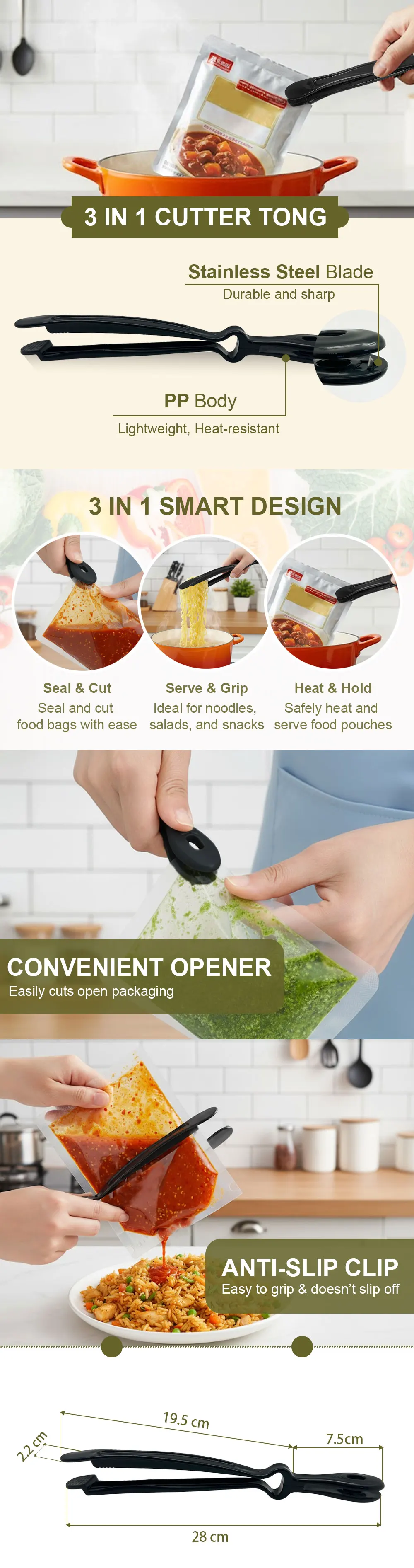 Built with a sharp stainless steel blade for quick cutting and a strong PP body for heat resistance, these tongs deliver both functionality and durability. The anti-slip handle provides a secure grip, while the 3-in-1 smart design enables sealing, cutting, and serving with one tool. Compact and easy to clean, they are ideal for daily cooking tasks.