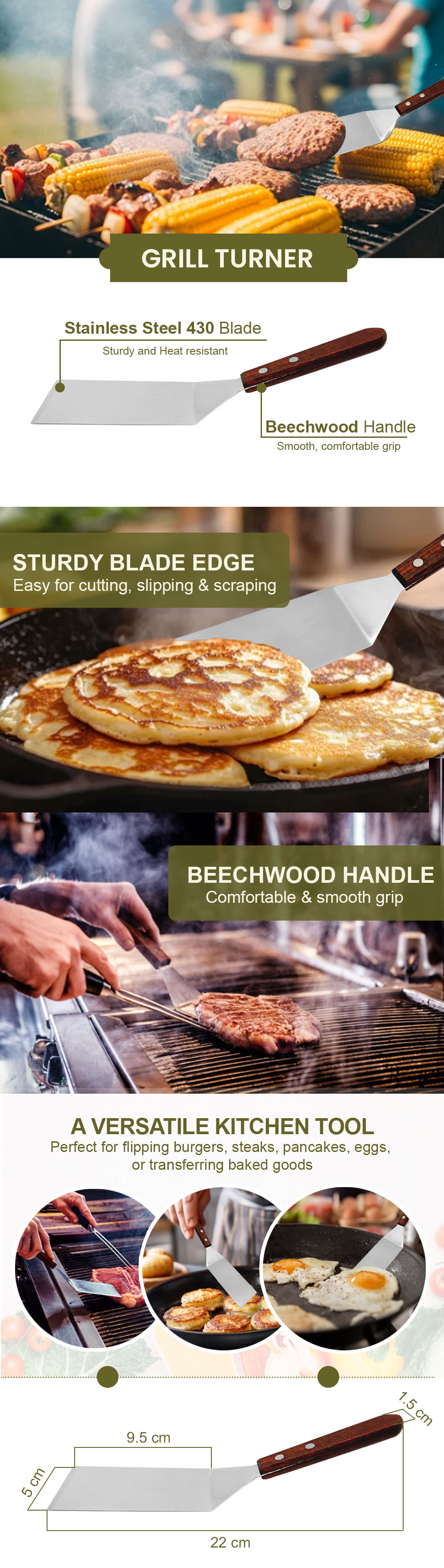 Perfect for flipping burgers, steaks, pancakes, eggs, fish, and grilled vegetables, this BBQ turner is designed for versatility. The beveled edge allows precise cutting and lifting, while the stainless steel blade ensures durability during high-heat grilling or cooking on a flat top.