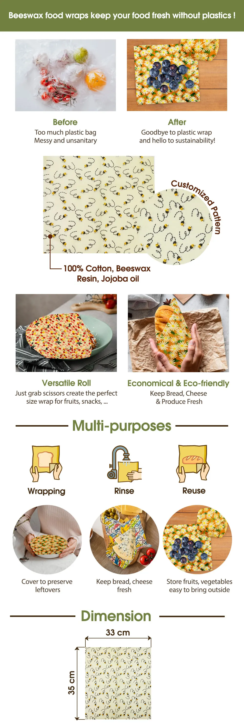 Reusable and washable, reducing the need for disposable plastic wrap and supporting a sustainable lifestyle.