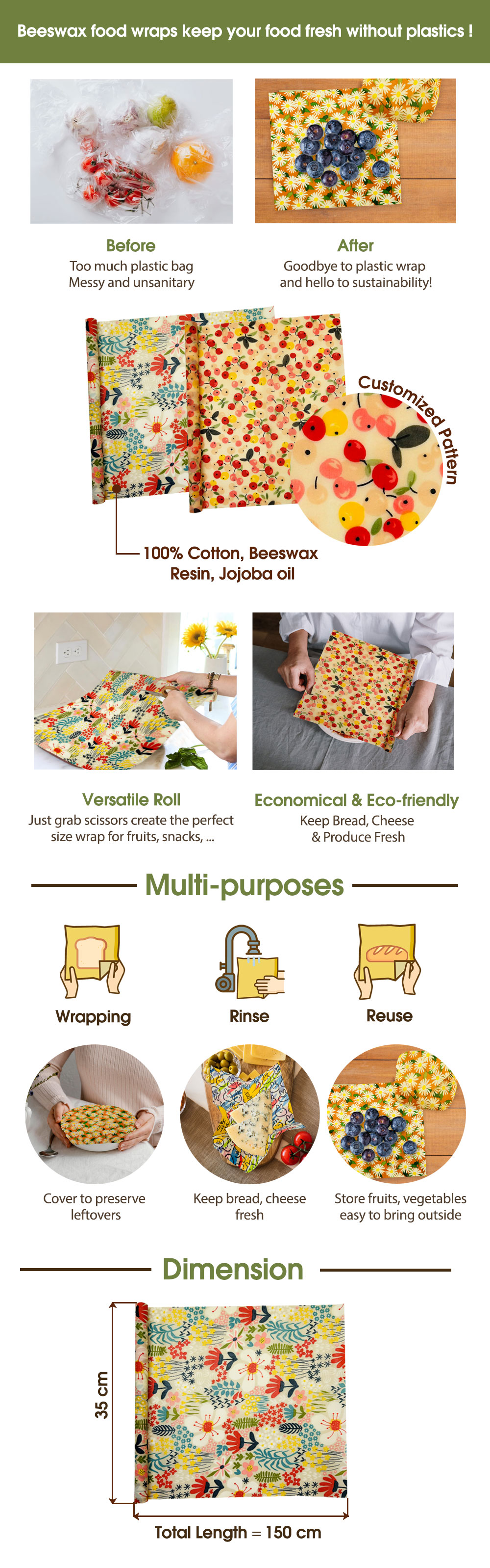 Large roll format (35 x 150 cm) allows you to cut the perfect size for sandwiches, fruit, cheese, or storage bowls.