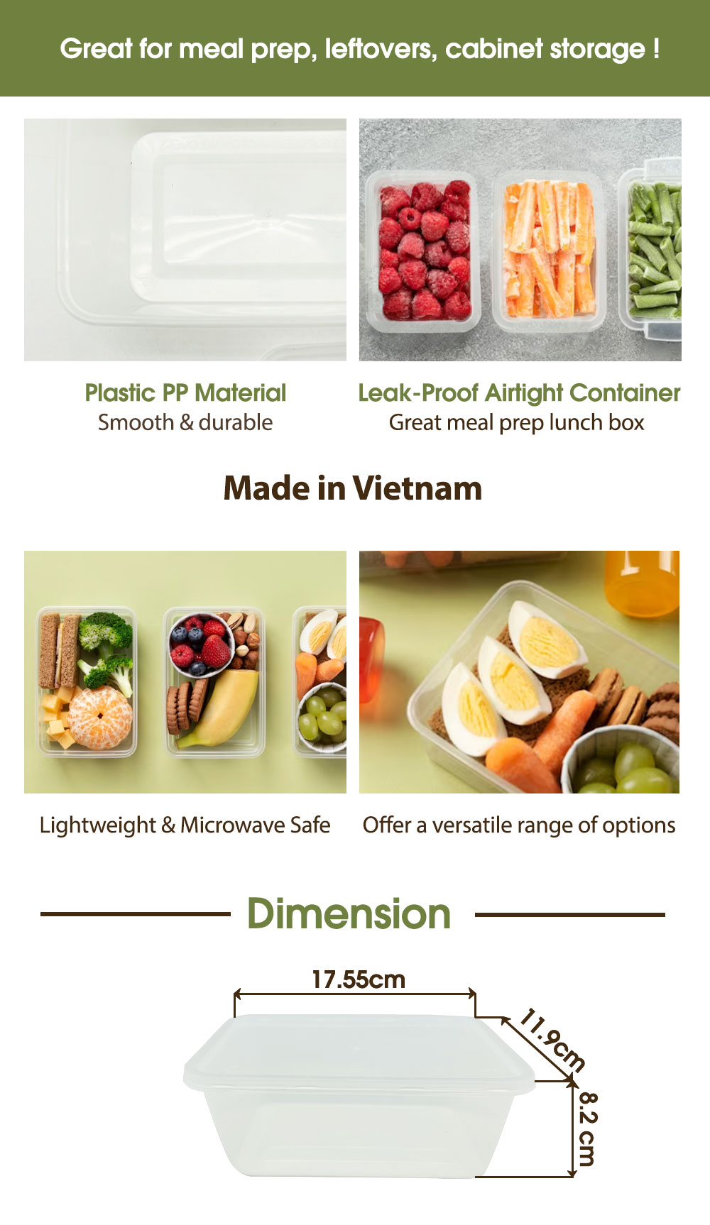 1000ml Clear Plastic Food Storage Container | Leakproof Reusable PP Box Made in Vietnam