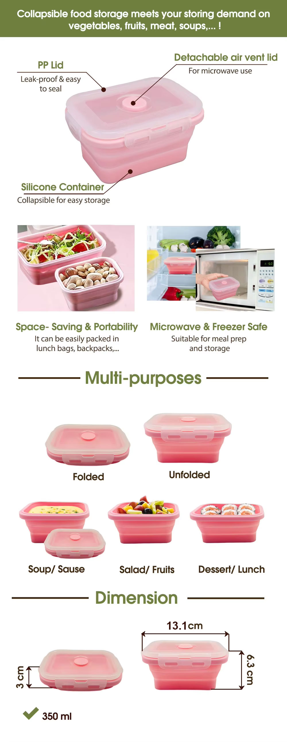 Features: Airtight | Leakproof | Collapsible | Microwave & Freezer Safe | Reusable