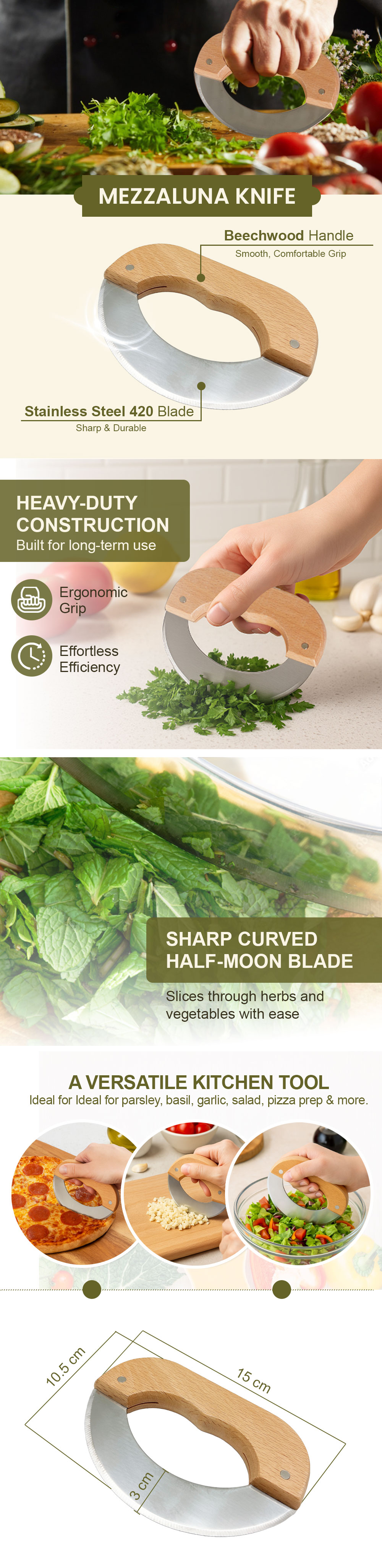 Sharp Curved Blade: Half-moon design made from stainless steel 420 delivers clean, even cuts with each rocking motion.