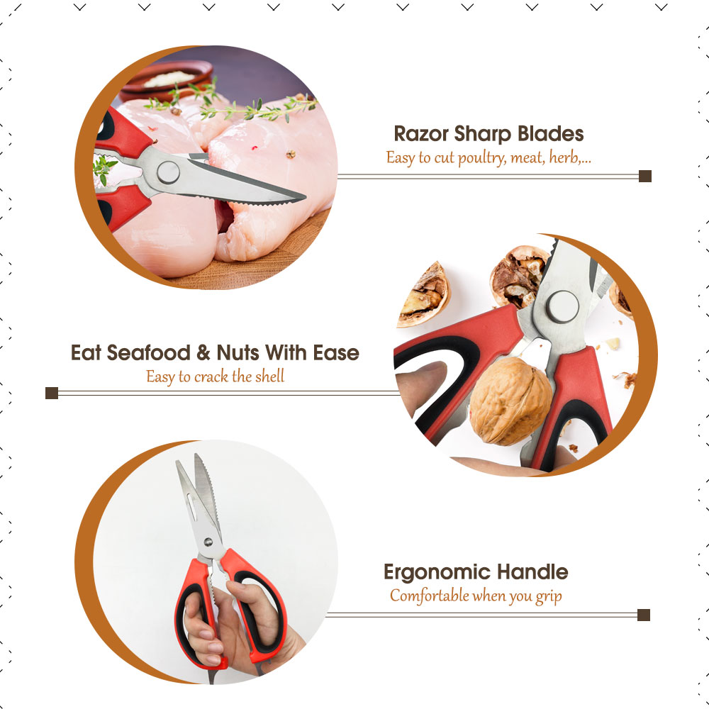 Perfect for preparing poultry, cutting raw or cooked meat, trimming herbs, cracking nuts, opening bottles, and handling seafood shells. These multifunction kitchen shears are designed to save time and effort, making them essential for both home kitchens and professional culinary settings.