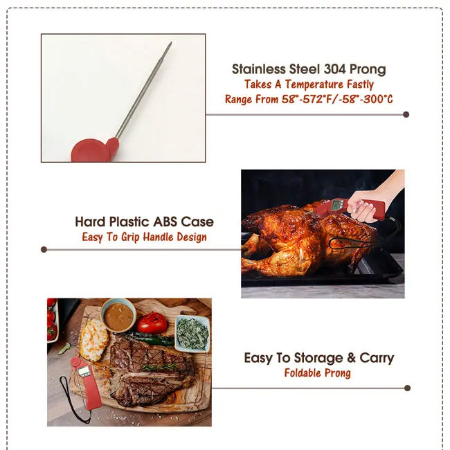 Perfect for checking the internal temperature of steaks, chicken, turkey, pork, or fish, this thermometer is versatile enough for BBQs, oven roasting, and stovetop cooking. A reliable tool for home cooks, grill enthusiasts, and professional chefs.